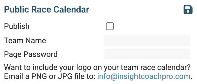 You can choose to publish your team’s upcoming races list to a password-protected web page. Click the “Publish” box, enter your team name and the page’s password, then click the “Save”