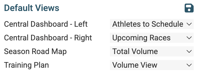 You can set your preferred default views for the Central Dashboard, Season Road Map, and Training Plan on the My Profile page.