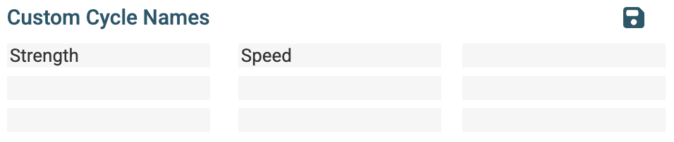 You can set custom Cycle names for use in the Season Road Map and Training Plan. Enter your cycle names and click the “Save” icon. Custom Cycle Names will appear at the top of the cycle list (in row order, ordered left-to-right within each row) on the Season Road Map and Training Plan.